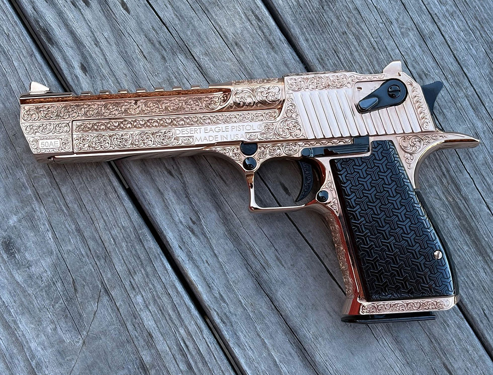 Colt 1911 Government model .45 ACP with full coverage scroll work engraving combination of laser and hand engraving. High Polished Royal Bluing with Nickel accents. Grips are engravd metal with nickel plating
